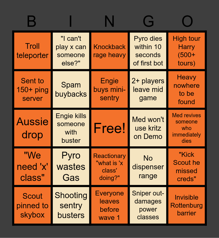This bingo card has a free space and 24 words: Scout pinned to skybox, Pyro wastes Gas, Engie buys mini-sentry, Sniper out-damages power classes, High tour Harry (500+ tours), Troll teleporter, "I can't play x can someone else?", Knockback rage heavy, Med won't use kritz on Demo, Med revives someone who immediately dies, Aussie drop, Spam buybacks, No dispenser range, "Kick Scout he missed creds", Sent to 150+ ping server, Shooting sentry busters, Everyone leaves before wave 1, Pyro dies within 10 seconds of first bot, Heavy nowhere to be found, "We need 'x' class", Engie kills someone with buster, Reactionary "what is 'x class' doing?", 2+ players leave mid game and Invisible Rottenburg barrier.