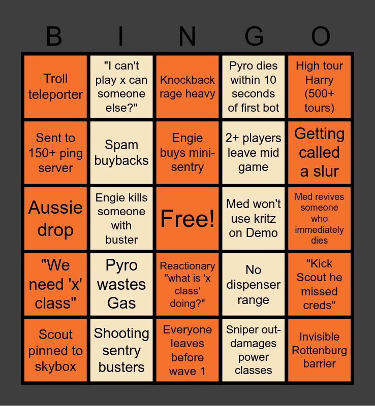 This bingo card has a free space and 24 words: Scout pinned to skybox, Pyro wastes Gas, Engie buys mini-sentry, Sniper out-damages power classes, High tour Harry (500+ tours), Troll teleporter, "I can't play x can someone else?", Knockback rage heavy, Med won't use kritz on Demo, Med revives someone who immediately dies, Aussie drop, Spam buybacks, No dispenser range, "Kick Scout he missed creds", Sent to 150+ ping server, Shooting sentry busters, Everyone leaves before wave 1, Pyro dies within 10 seconds of first bot, Getting called a slur, "We need 'x' class", Engie kills someone with buster, Reactionary "what is 'x class' doing?", 2+ players leave mid game and Invisible Rottenburg barrier.