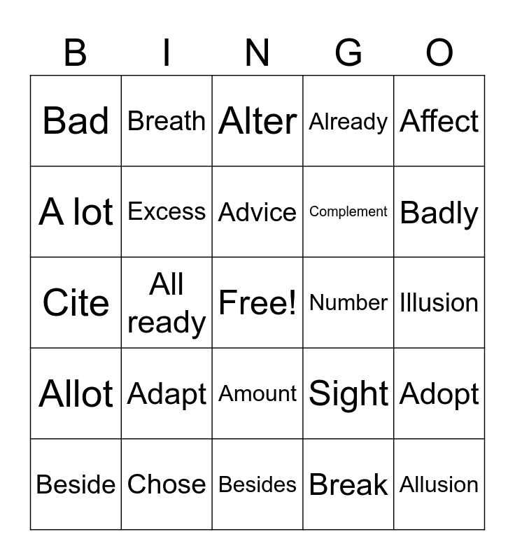 This bingo card has a free space and 37 words: Accept, Except, Access, Excess, Adopt, Adapt, Advice, Advise, Affect, Effect, All ready, Already, Allusion, Illusion, A lot, Allot, Altar, Alter, Amount, Number, Bad, Badly, Beside, Besides, Brake, Break, Breath, Breathe, Capital, Capitol, Choose, Chose, Cite, Site, Sight, Complement and Compliment.