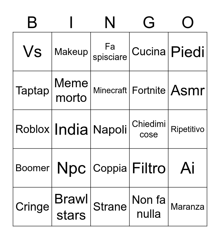 This bingo card has a free space and 24 words: Npc, Brawl stars, Minecraft, Cringe, Piedi, Vs, Taptap, Makeup, Chiedimi cose, Coppia, Fortnite, Roblox, Filtro, Ai, Meme morto, Non fa nulla, Ripetitivo, Fa spisciare, Asmr, India, Maranza, Boomer, Cucina and Strane.