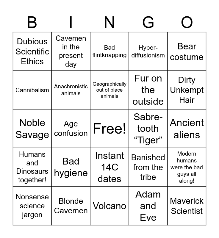This bingo card has a free space and 28 words: Modern humans were the bad guys all along!, Misogyny, Fur on the outside, Adam and Eve, Cannibalism, Bad flintknapping, Cavemen in the present day, Humans and Dinosaurs together!, Sabre- tooth “Tiger”, Nonsense science jargon, Noble Savage, Hyper- diffusionism, Blonde Cavemen, Volcano, Dirty Unkempt Hair, Bad teeth, Bad hygiene, Anachronistic animals, Geographically out of place animals, Instant 14C dates, Dubious Scientific Ethics, Grunting, Maverick Scientist, Age confusion, Ancient aliens, Banished from the tribe, Bear costume and Conlang.
