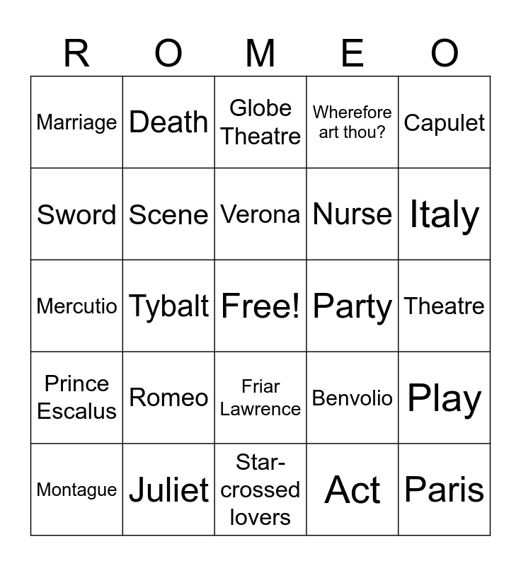 This bingo card has a free space and 24 words: Romeo, Juliet, Verona, Montague, Capulet, Marriage, Sword, Death, Party, Friar Lawrence, Nurse, Mercutio, Benvolio, Play, Scene, Act, Theatre, Globe Theatre, Italy, Tybalt, Paris, Prince Escalus, Wherefore art thou? and Star-crossed lovers.