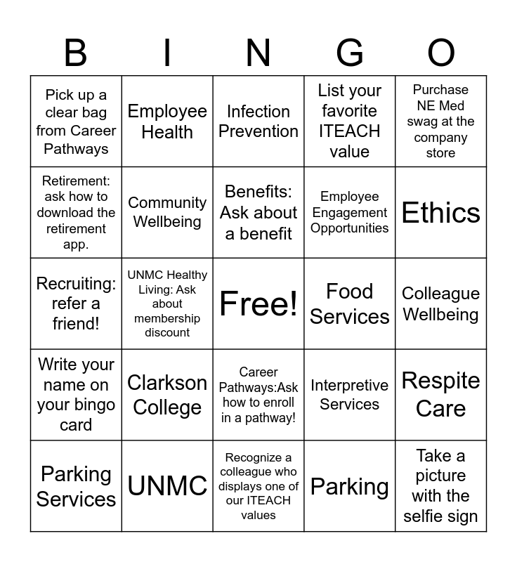 This bingo card has a free space and 24 words: Clarkson College, UNMC, Benefits: Ask about a benefit, Parking Services, Purchase NE Med swag at the company store, Pick up a clear bag from Career Pathways, Retirement: ask how to download the retirement app., Employee Health, Food Services, Career Pathways:Ask how to enroll in a pathway!, Employee Engagement Opportunities, Recruiting: refer a friend!, Interpretive Services, Respite Care, Community Wellbeing, Parking, Colleague Wellbeing, Infection Prevention, Ethics, UNMC Healthy Living: Ask about membership discount, Take a picture with the selfie sign, Write your name on your bingo card, List your favorite ITEACH value and Recognize a colleague who displays one of our ITEACH values.