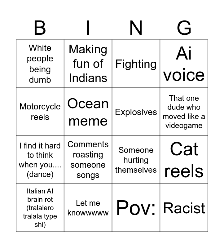 This bingo card has 16 words: Italian AI brain rot (tralalero tralala type shi), Let me knowwwww, Fighting, Ai voice, Motorcycle reels, Making fun of Indians, Someone hurting themselves, Cat reels, White people being dumb, Ocean meme, Pov:, That one dude who moved like a videogame, I find it hard to think when you.... (dance), Comments roasting someone songs, Explosives and Racist.