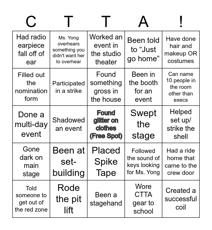 This bingo card has a free space and 29 words: Told someone to get out of the red zone, Seen Baby the cat, Shadowed an event, Been in Circle Time, Had radio earpiece fall off of ear, Worked an event in the studio theater, Participated in a strike, Been at set-building, Swept the stage, Rode the pit lift, Helped set up/ strike the shell, Created a successful coil, Been a stagehand, Wore CTTA gear to school, Can name 10 people in the room other than execs, Mopped the stage, Placed Spike Tape, Gone dark on main stage, Have done hair and makeup OR costumes, Done a multi-day event, Followed the sound of keys looking for Ms. Yong, Said “thank you” to rigging, Been in the booth for an event, Filled out the nomination form, Been told to “Just go home”, Ms. Yong overhears something you didn't want her to overhear, Had a ride home that came to the crew door, Found something gross in the house and Battled with a doorstop.
