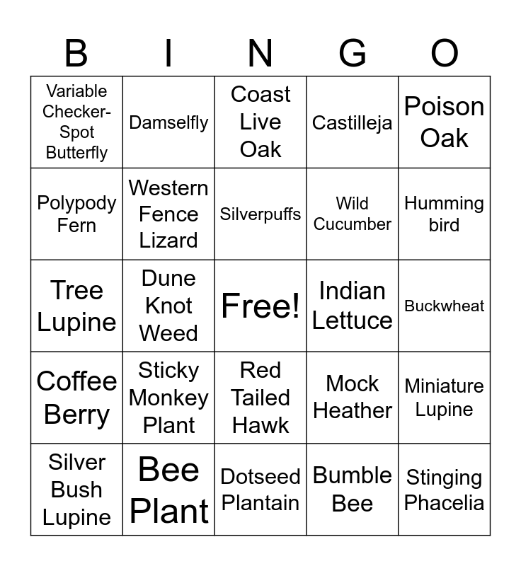 This bingo card has a free space and 29 words: Silver Bush Lupine, SF Wallflower, Dune Knot Weed, Yarrow, Variable Checker-Spot Butterfly, Coast Live Oak, Western Fence Lizard, Sticky Monkey Plant, Indian Lettuce, Bee Plant, Buckwheat, Stinging Phacelia, Dotseed Plantain, Bumble Bee, Humming bird, CA Poppy, Red Tailed Hawk, Coffee Berry, Poison Oak, Tree Lupine, Mock Heather, Dune Gilia, Wild Cucumber, Polypody Fern, Castilleja, Damselfly, Miniature Lupine, Silverpuffs and White Crown Sparrow.