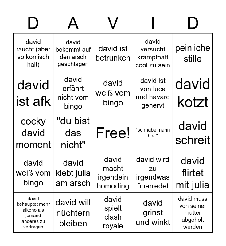This bingo card has a free space and 24 words: david klebt julia am arsch, david will nüchtern bleiben, david weiß vom bingo, david behauptet mehr alkoho als jemand anderes zu vertragen, peinliche stille, david raucht (aber so komisch halt), david ist afk, david bekommt auf den arsch geschlagen, "schnabelmann hier", david macht irgendein homoding, david ist von luca und havard genervt, cocky david moment, david wird zu irgendwas überredet, david flirtet mit julia, david erfährt nicht vom bingo, david grinst und winkt, david schreit, david ist betrunken, david kotzt, "du bist das nicht", david muss von seiner mutter abgeholt werden, david weiß vom bingo, david versucht krampfhaft cool zu sein and david spielt clash royale.