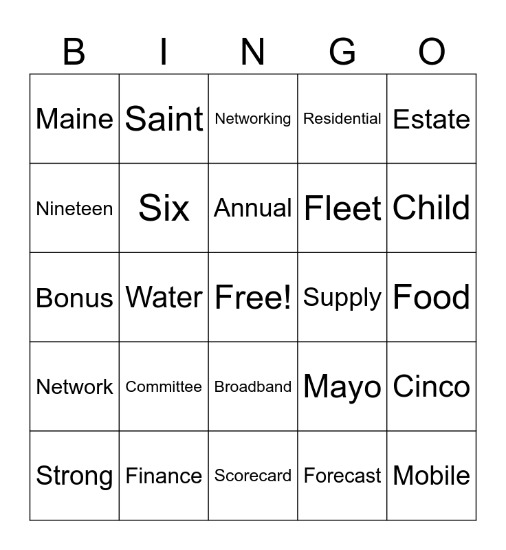 This bingo card has a free space and 49 words: Quarter, Mobile, Celestial, Scorecard, Committee, Learning, Saint, Joseph's, Nineteen, Twenty, Six, Residential, Cinco, Mayo, Residential, Portfolio, Annual, Supply, Real, Estate, Water, Forecast, Maine, Fleet, CXSO, Child, Strong, Wireless, Broadband, Network, Broadband, Epic, All, Hands, Finance, Virginia, Program, Budget, Food, Lunch, Projections, Initiatives, Pie, Northeast, Bonus, Networking, Penn, State and Teams.