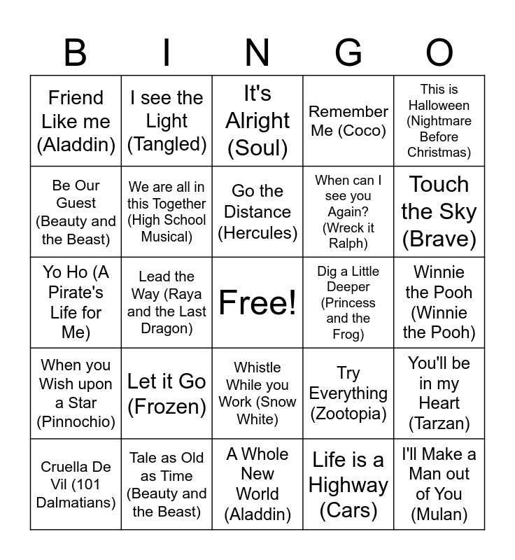 This bingo card has a free space and 48 words: You're Welcome (Moana), I'll Make a Man out of You (Mulan), We Don't Talk about Bruno (Encanto), A Whole New World (Aladdin), Let it Go (Frozen), Kiss the Girl (Little Mermaid), I see the Light (Tangled), Hakuna Maktata (Lion King), Be Our Guest (Beauty and the Beast), The Bare Necessities (Jungle Book), We are all in this Together (High School Musical), Remember Me (Coco), You'll be in my Heart (Tarzan), Try Everything (Zootopia), Colors of the Wind (Pocahontas), You've got a Friend in Me (Toy Story), Go the Distance (Hercules), Dig a Little Deeper (Princess and the Frog), Bibbidi-Bobbidi-Bo (Cinderella), This is Halloween (Nightmare Before Christmas), Lead the Way (Raya and the Last Dragon), Life is a Highway (Cars), Friend Like me (Aladdin), When can I see you Again? (Wreck it Ralph), Hawaiin Rollercoaster Ride (Lilo and Stitch), Touch the Sky (Brave), Cruella De Vil (101 Dalmatians), Just a Spoonful of Sugar (Mary Poppins), Whistle While you Work (Snow White), When you Wish upon a Star (Pinnochio), Circle of Life (Lion King), Everybody wants to be a Cat (Aristocats), Carried me with You (Onward), Do-Re-Mi (Sound of Music), Tale as Old as Time (Beauty and the Beast), Do you Want to Build a Snowman? (Frozen), Baby Mine (Dumbo), Winnie the Pooh (Winnie the Pooh), Poor Unfortunate Souls (Little Mermaid), Bella Note (Lady and the Tramp), You can Fly! You can Fly! You can Fly! (Peter Pan), Oo-De-Lally (Robin Hood), It's Alright (Soul), Once Upon a Dream (Maleficent), Yo Ho (A Pirate's Life for Me), Married Life (Up), If I didn't Have You (Monster's Inc) and Le Festin (Ratatouille).