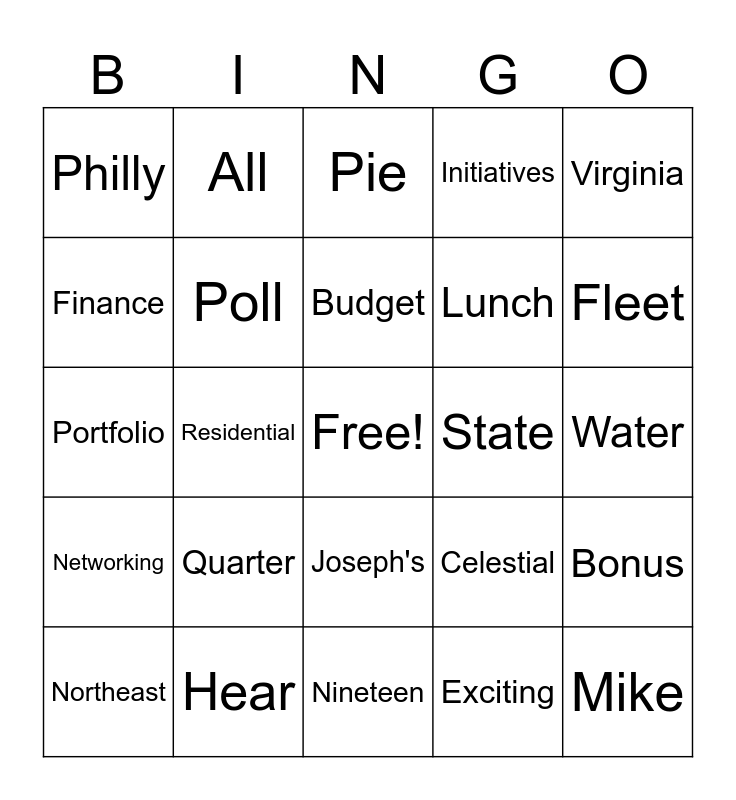 This bingo card has a free space and 58 words: Online, Hear, Mic, Networking, Exciting, News, Poll, Food, Lunch, Projections, Initiatives, Penn, Supply, Real, Cheesesteak, Philly, Mike, Virginia, Program, Budget, State, Pie, Northeast, Bonus, Estate, Water, Forecast, Maine, Fleet, CXSO, Child, Strong, Wireless, Broadband, Network, Cinco, Mayo, Residential, Portfolio, Annual, Quarter, Mobile, Celestial, Scorecard, Committee, Learning, Saint, Joseph's, Nineteen, Twenty, Six, Residential, Broadband, Epic, All, Hands, Finance and Teams.