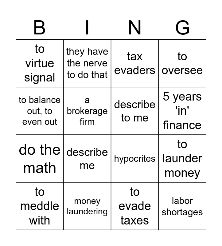 This bingo card has 16 words: money laundering, to launder money, tax evaders, to virtue signal, do the math, they have the nerve to do that, hypocrites, to evade taxes, to balance out, to even out, a brokerage firm, to meddle with, to oversee, describe me, 5 years 'in' finance, describe to me and labor shortages.