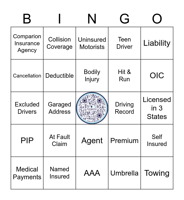This bingo card has a free space and 34 words: Split Limit, Umbrella, State Minimums, Full Coverage, PIP, Deductible, Liability, Medical Payments, Collision Coverage, Other Than Collision Coverage, Bodily Injury, Uninsured Motorists, Discounts, Claims History, Driving Record, OIC, Named Insured, Excluded Drivers, At Fault Claim, Premium, Agent, Learners Permit, Comparion Insurance Agency, Licensed in 3 States, AAA, Towing, Teen Driver, Accident, Hit & Run, Cancellation, Policy, Garaged Address, Self Insured and SR-22.