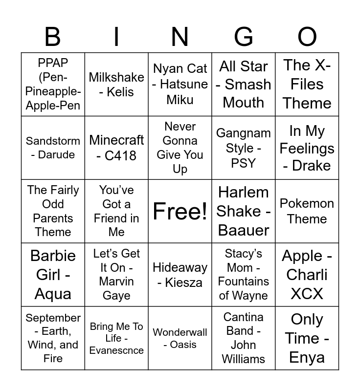 This bingo card has a free space and 27 words: Even Flow - Pearl Jam, Bring Me To Life - Evanescnce, Never Gonna Give You Up, Cantina Band - John Williams, The X-Files Theme, Sandstorm - Darude, Milkshake - Kelis, Wonderwall - Oasis, Harlem Shake - Baauer, Apple - Charli XCX, Barbie Girl - Aqua, Minecraft - C418, Stacy’s Mom - Fountains of Wayne, Only Time - Enya, The Fairly Odd Parents Theme, party 4 u - Charli XCX, Nyan Cat - Hatsune Miku, All Star - Smash Mouth, Pokemon Theme, PPAP (Pen-Pineapple-Apple-Pen, Let’s Get It On - Marvin Gaye, Hideaway - Kiesza, Gangnam Style - PSY, In My Feelings - Drake, September - Earth, Wind, and Fire, You’ve Got a Friend in Me and Perry the Platypus Theme.