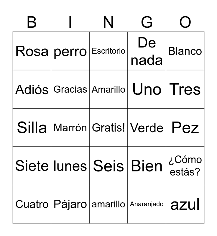 This bingo card has a free space and 47 words: rojo, azul, trangulo, amarillo, lunes, viernes, perro, Hola, Adiós, Por favor, Gracias, De nada, ¿Cómo estás?, Bien, Rojo, Azul, Amarillo, Verde, Negro, Blanco, Marrón, Anaranjado, Rosa, Uno, Dos, Tres, Cuatro, Cinco, Seis, Siete, Ocho, Nueve, Diez, .Perro, Gato, Pájaro, Pez, Caballo, Vaca, Libro, Lápiz, Escritorio, Silla, Escuela, Maestro, Maestra and Mal.
