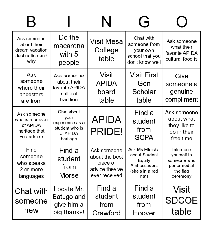 This bingo card has a free space and 24 words: Find a student from Morse, Locate Mr. Batugo and give him a big thanks!, Visit APIDA board table, Chat with someone new, Ask someone what their favorite APIDA cultural food is, Ask someone about their dream vacation destination and why, Ask someone where their ancestors are from, Do the macarena with 5 people, Find a student from SCPA, Ask someone about the best piece of advice they've ever received, Visit First Gen Scholar table, Ask someone who is a person of APIDA heritage that you admire, Ask Ms Elleisha about Student Equity Ambassadors (she's in a red hat), Introduce yourself to someone who performed at the flag ceremony, Ask someone about their favorite APIDA cultural tradition, Find a student from Hoover, Ask someone about what they like to do in their free time, Visit Mesa College table, Give someone a genuine compliment, Chat about your experience as a student who is of APIDA heritage, Visit SDCOE table, Find someone who speaks 2 or more languages, Chat with someone from your own school that you don't know well and Find a student from Crawford.