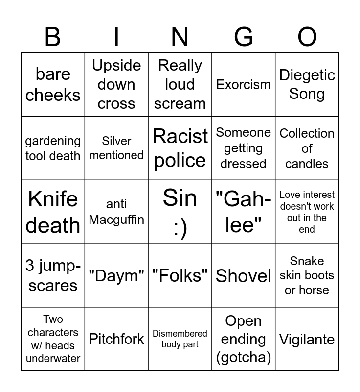 This bingo card has a free space and 24 words: "Daym", Pitchfork, Racist police, Two characters w/ heads underwater, Diegetic Song, bare cheeks, gardening tool death, Upside down cross, "Gah-lee", "Folks", Someone getting dressed, Knife death, Shovel, Snake skin boots or horse, Silver mentioned, Open ending (gotcha), Love interest doesn't work out in the end, Really loud scream, Collection of candles, anti Macguffin, Vigilante, 3 jump-scares, Exorcism and Dismembered body part.