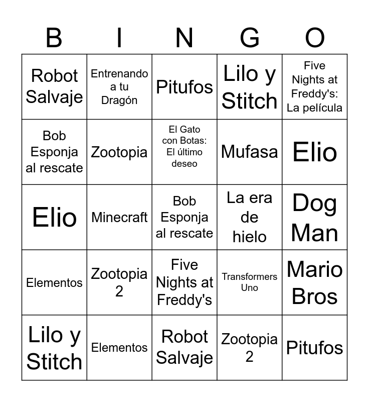 ⚠ This card has duplicate items: Red (3), Kung Fu Panda (3), Sing (3), Robot Salvaje (3), Flow (3), Dalia (3), Mufasa (3), Memorias de un Caracol (3), Soul (3), La era de hielo (3), Garfield (3), Mario Bros (3), Hotel Transilvania (3), Elementos (3), Intensamente 2 (2), Angry Birds (3), Shrek (3), Transformers Uno (2), Elio (3), Avengers (3), Pitufos (3), Lilo y Stitch (3), Entrenando a tu Dragón (live action) (2), Minecraft (3), Plankton (3), Norion en la Oscuridad (2), Sonic (3), Bad Guys (3), Dog Man (3), Bob Esponja al rescate (2), El Gato con Botas: El último deseo (2), Mi Villano Favorito 4 (2), Five Nights at Freddy's: La película (2), Moana 2 (2), LEGO Movie (2), They the Earth Blew Up (2), Zootopia 2 (2)