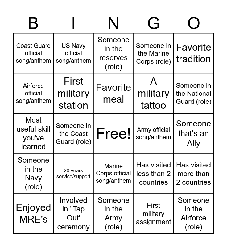 This bingo card has a free space and 24 words: 20 years service/support, Involved in "Tap Out' ceremony, Favorite meal, Enjoyed MRE's, Favorite tradition, Coast Guard official song/anthem, Airforce official song/anthem, US Navy official song/anthem, Army official song/anthem, Marine Corps official song/anthem, A military tattoo, Most useful skill you've learned, Has visited less than 2 countries, Has visited more than 2 countries, First military station, First military assignment, Someone that's an Ally, Someone in the reserves (role), Someone in the National Guard (role), Someone in the Coast Guard (role), Someone in the Airforce (role), Someone in the Navy (role), Someone in the Marine Corps (role) and Someone in the Army (role).