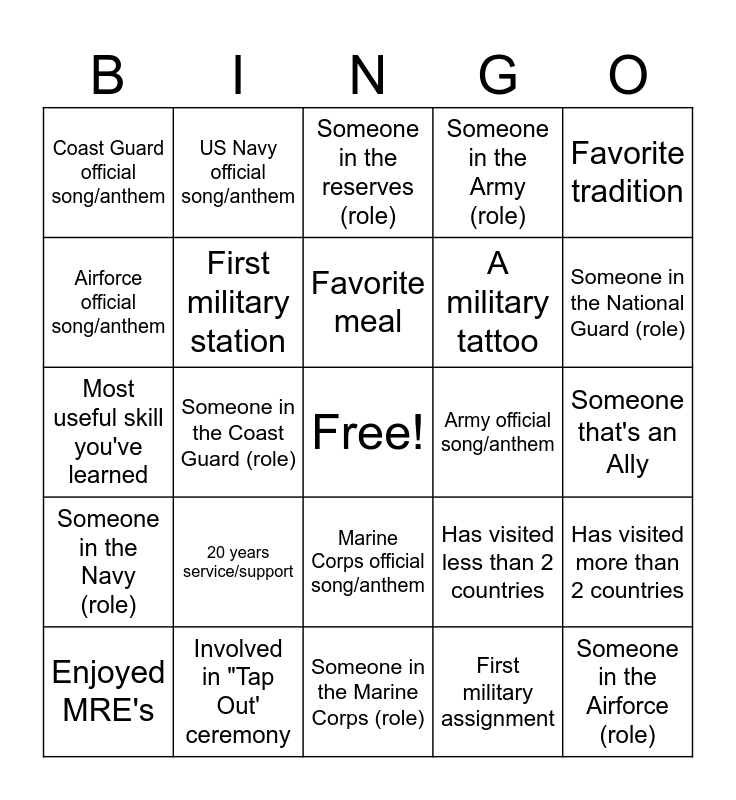 This bingo card has a free space and 24 words: 20 years service/support, Involved in "Tap Out' ceremony, Favorite meal, Enjoyed MRE's, Favorite tradition, Coast Guard official song/anthem, Airforce official song/anthem, US Navy official song/anthem, Army official song/anthem, Marine Corps official song/anthem, A military tattoo, Most useful skill you've learned, Has visited less than 2 countries, Has visited more than 2 countries, First military station, First military assignment, Someone that's an Ally, Someone in the reserves (role), Someone in the National Guard (role), Someone in the Coast Guard (role), Someone in the Airforce (role), Someone in the Navy (role), Someone in the Army (role) and Someone in the Marine Corps (role).