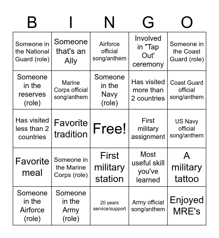 This bingo card has a free space and 24 words: Someone in the Marine Corps (role), Someone in the Army (role), Someone in the Navy (role), Someone in the Airforce (role), Someone in the Coast Guard (role), Someone in the National Guard (role), Someone in the reserves (role), Someone that's an Ally, First military assignment, First military station, Has visited more than 2 countries, Has visited less than 2 countries, Most useful skill you've learned, A military tattoo, Marine Corps official song/anthem, Army official song/anthem, US Navy official song/anthem, Airforce official song/anthem, Coast Guard official song/anthem, Favorite tradition, Enjoyed MRE's, Favorite meal, Involved in "Tap Out' ceremony and 20 years service/support.