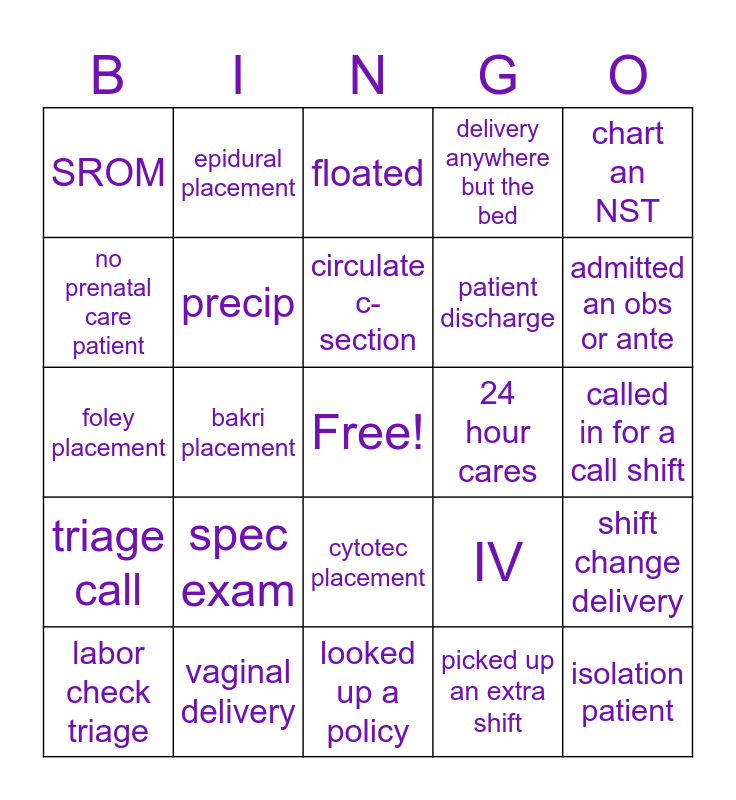 This bingo card has a free space and 24 words: spec exam, vaginal delivery, circulate c-section, labor check triage, chart an NST, SROM, no prenatal care patient, epidural placement, 24 hour cares, cytotec placement, patient discharge, foley placement, IV, shift change delivery, precip, picked up an extra shift, called in for a call shift, floated, admitted an obs or ante, bakri placement, isolation patient, triage call, delivery anywhere but the bed and looked up a policy.