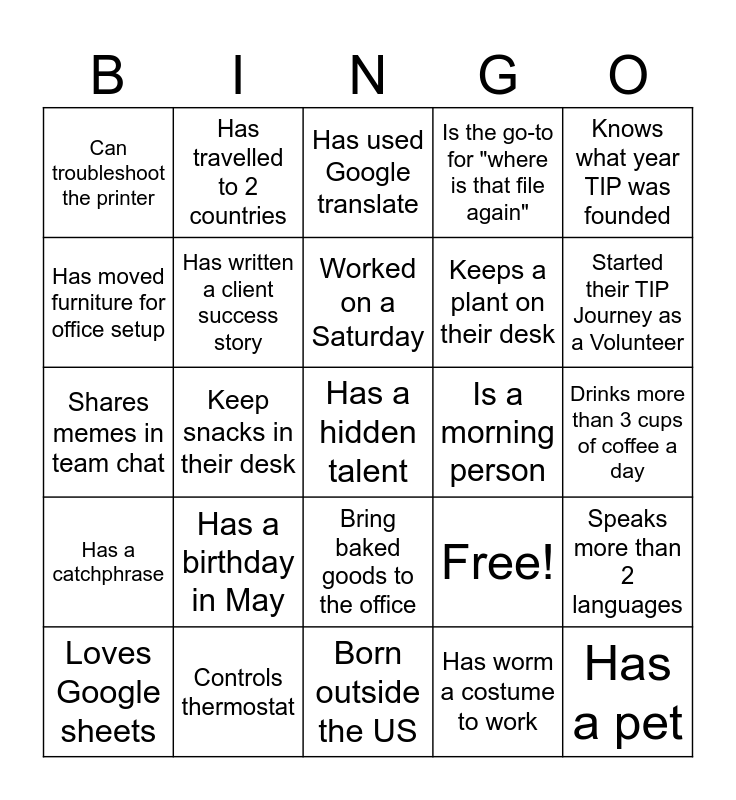 This bingo card has 25 words: Has a birthday in May, Born outside the US, Worked on a Saturday, Loves Google sheets, Knows what year TIP was founded, Can troubleshoot the printer, Has moved furniture for office setup, Has travelled to 2 countries, Is a morning person, Bring baked goods to the office, Keeps a plant on their desk, Shares memes in team chat, Free!, Speaks more than 2 languages, Has written a client success story, Has a pet, Drinks more than 3 cups of coffee a day, Has used Google translate, Started their TIP Journey as a Volunteer, Keep snacks in their desk, Has a hidden talent, Controls thermostat, Has a catchphrase, Is the go-to for "where is that file again" and Has worm a costume to work.