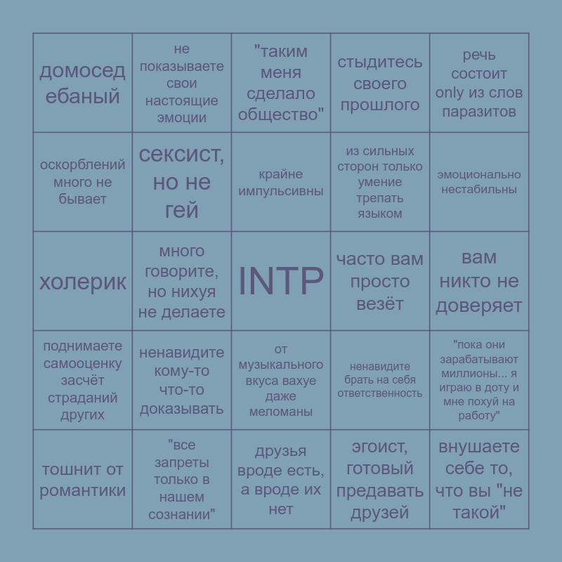 This bingo card has a free space and 24 words: ненавидите кому-то что-то доказывать, "все запреты только в нашем сознании", крайне импульсивны, тошнит от романтики, речь состоит only из слов паразитов, домосед ебаный, оскорблений много не бывает, не показываете свои настоящие эмоции, часто вам просто везёт, от музыкального вкуса вахуе даже меломаны, из сильных сторон только умение трепать языком, холерик, ненавидите брать на себя ответственность, "пока они зарабатывают миллионы... я играю в доту и мне похуй на работу", сексист, но не гей, эгоист, готовый предавать друзей, вам никто не доверяет, "таким меня сделало общество", эмоционально нестабильны, много говорите, но нихуя не делаете, внушаете себе то, что вы "не такой", поднимаете самооценку засчёт страданий других, стыдитесь своего прошлого and друзья вроде есть, а вроде их нет.
