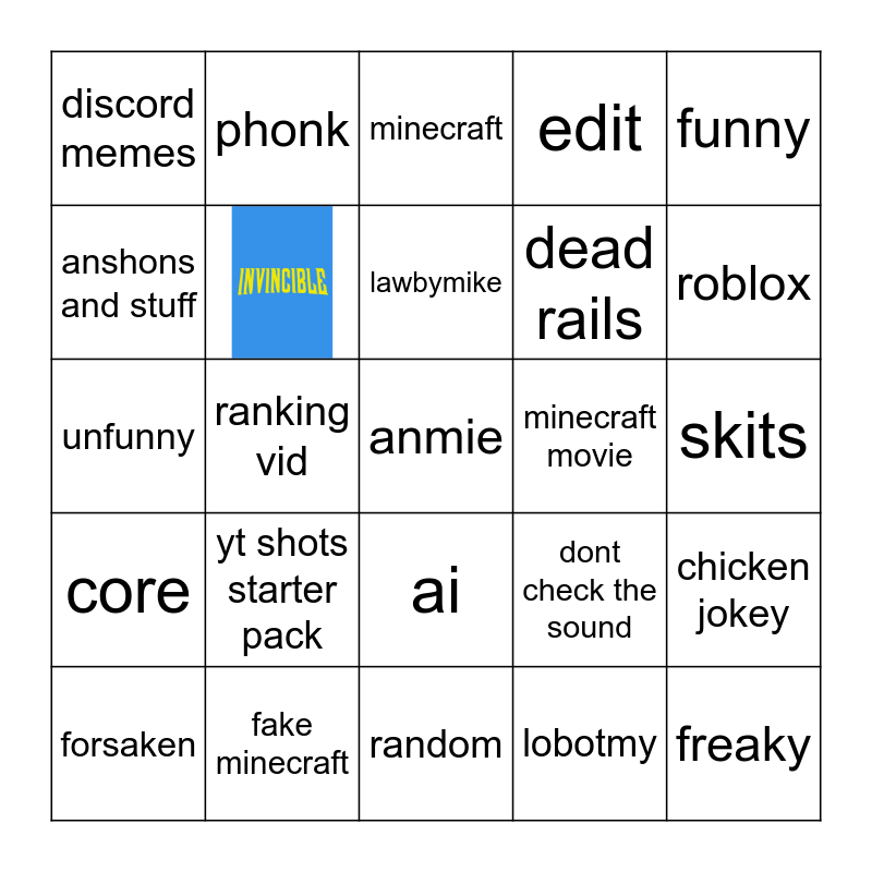 This bingo card has 1 images and 24 words: yt shots starter pack, random, lawbymike, forsaken, funny, discord memes, anshons and stuff, phonk, minecraft movie, ai, dead rails, unfunny, dont check the sound, chicken jokey, freaky, skits, minecraft, roblox, ranking vid, anmie, fake minecraft, core, edit and lobotmy.