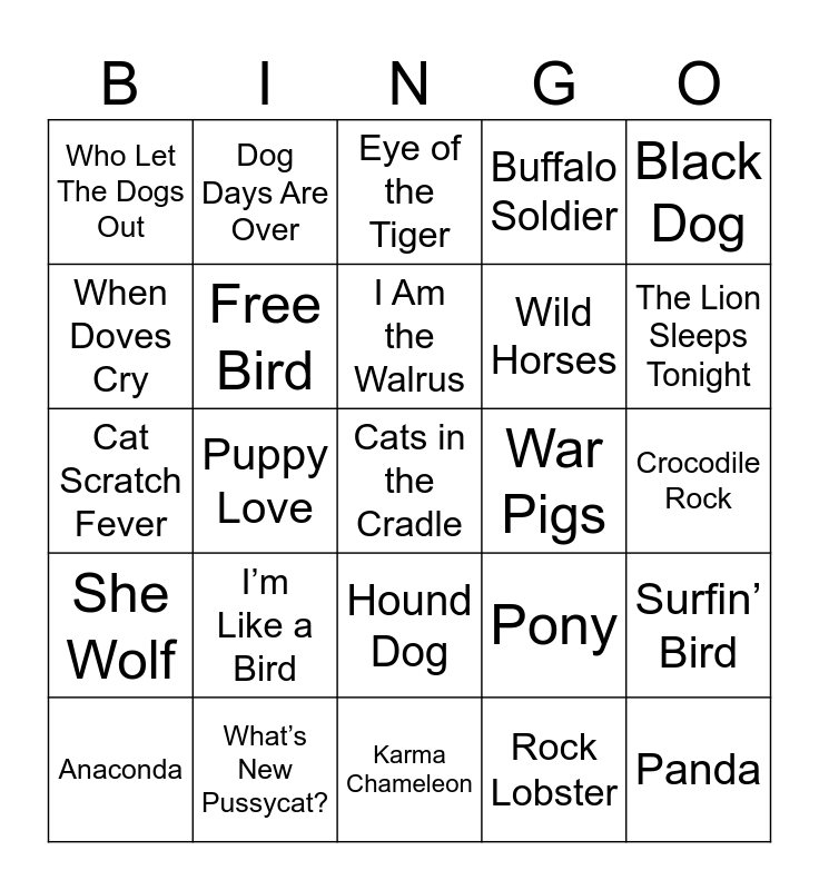 This bingo card has 29 words: Anaconda, What Does The Fox Say, Puppy Love, Panda, Who Let The Dogs Out, Eye of the Tiger, Free Bird, I’m Like a Bird, War Pigs, What’s New Pussycat?, Crocodile Rock, Cats in the Cradle, Karma Chameleon, Rock Lobster, The Lion Sleeps Tonight, Hungry Like the Wolf, Hound Dog, She Wolf, Black Dog, Cat Scratch Fever, Pony, A Horse with No Name, Wild Horses, When Doves Cry, Buffalo Soldier, Dog Days Are Over, Surfin’ Bird, I Am the Walrus and Dark Horse.