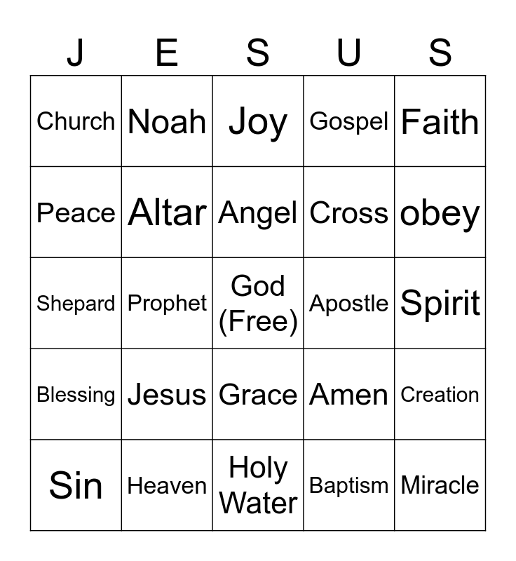 This bingo card has a free space and 24 words: Jesus, Heaven, Angel, Sin, Faith, Church, Peace, Noah, Apostle, Grace, Cross, Shepard, Amen, Creation, Altar, Baptism, Spirit, Joy, obey, Prophet, Miracle, Blessing, Gospel and Holy Water.