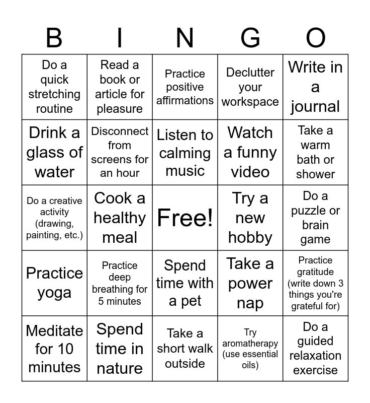 This bingo card has a free space and 25 words: Practice deep breathing for 5 minutes, Take a short walk outside, Listen to calming music, Meditate for 10 minutes, Write in a journal, Do a quick stretching routine, Drink a glass of water, Read a book or article for pleasure, Try a new hobby, Spend time with a pet, Watch a funny video, Do a creative activity (drawing, painting, etc.), Take a power nap, Practice gratitude (write down 3 things you're grateful for), Disconnect from screens for an hour, Talk to a friend or family member, Do a puzzle or brain game, Practice positive affirmations, Take a warm bath or shower, Cook a healthy meal, Do a guided relaxation exercise, Spend time in nature, Practice yoga, Declutter your workspace and Try aromatherapy (use essential oils).