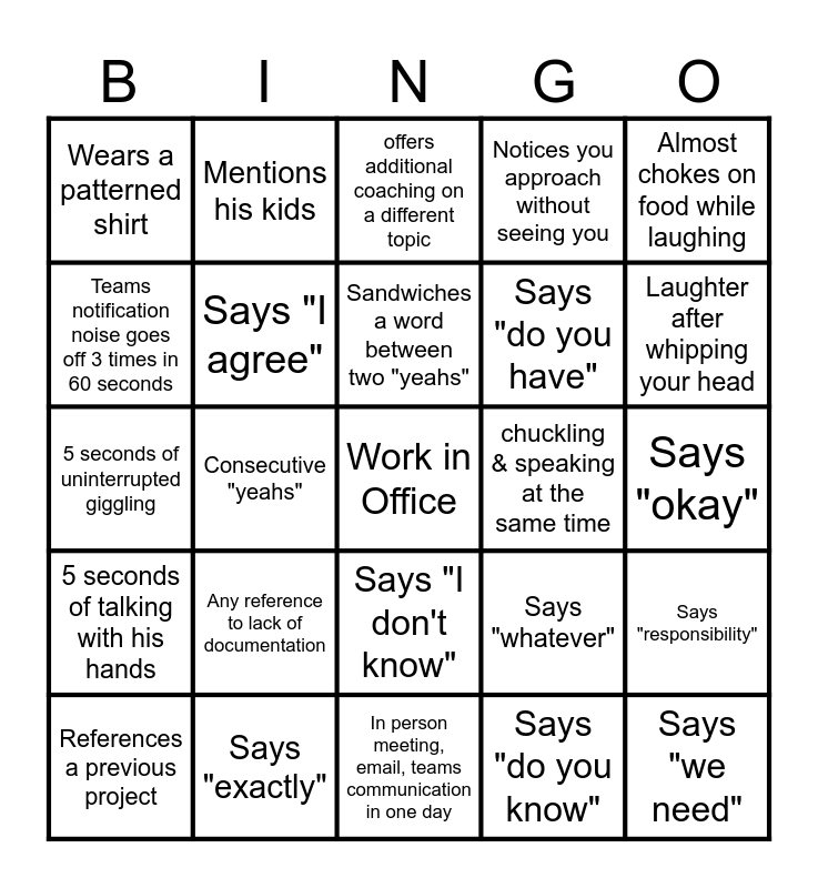 This bingo card has a free space and 24 words: Any reference to lack of documentation, Says "exactly", Sandwiches a word between two "yeahs", References a previous project, Almost chokes on food while laughing, Wears a patterned shirt, Teams notification noise goes off 3 times in 60 seconds, Mentions his kids, chuckling & speaking at the same time, Says "I don't know", Says "do you have", 5 seconds of uninterrupted giggling, Says "whatever", Says "responsibility", Says "I agree", Says "do you know", Says "okay", offers additional coaching on a different topic, Laughter after whipping your head, Consecutive "yeahs", Says "we need", 5 seconds of talking with his hands, Notices you approach without seeing you and In person meeting, email, teams communication in one day.