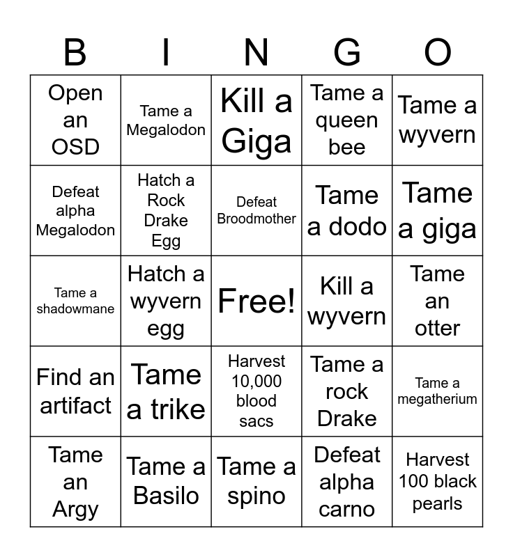 This bingo card has a free space and 29 words: Defeat Dragon, Tame a Basilo, Kill a Giga, Craft a Tek pistol, Tame a wyvern, Open an OSD, Hatch a Rock Drake Egg, Defeat Broodmother, Kill a wyvern, Tame a megatherium, Tame an Argy, Hatch a wyvern egg, Defeat alpha carno, Harvest 100 black pearls, Tame a shadowmane, Defeat Megapithecus, Tame a spino, Tame a rock Drake, Tame a giga, Find an artifact, Tame a trike, Defeat an alpha raptor, Tame a dodo, Tame an otter, Defeat alpha Megalodon, Tame a Megalodon, Harvest 10,000 blood sacs, Tame a queen bee and Hatch a titanoboa egg.