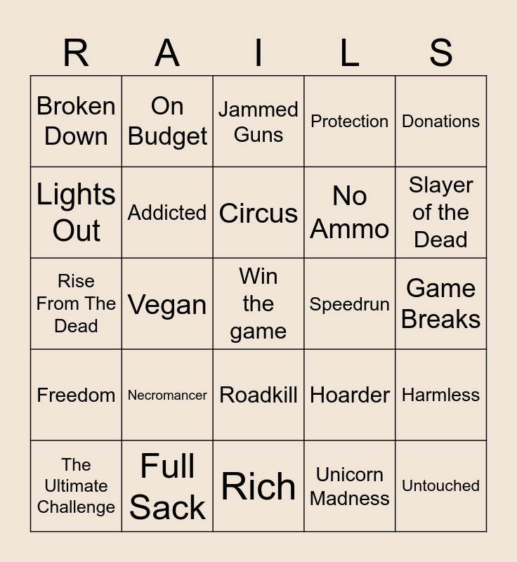 This bingo card has a free space and 26 words: Win Nightmare Mode, Necromancer, Rich, Unicorn Madness, Slayer of the Dead, Broken Down, On Budget, Jammed Guns, No Ammo, Harmless, Rise From The Dead, Vegan, Hoarder, Untouched, Freedom, Trespassed, Circus, Speedrun, Donations, The Ultimate Challenge, Addicted, Roadkill, Protection, Game Breaks, Lights Out and Full Sack.