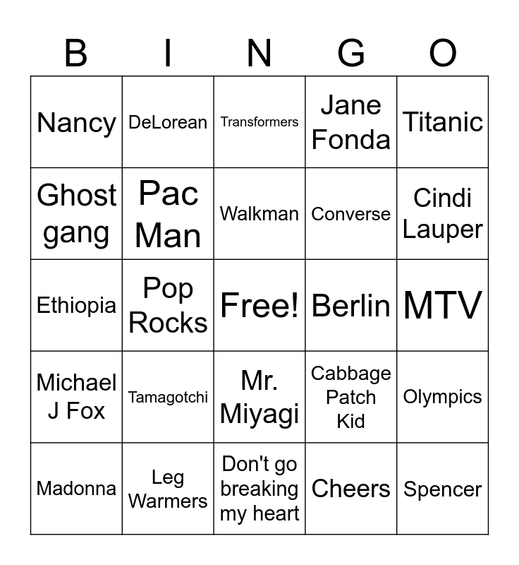 This bingo card has a free space and 34 words: Challenger, Cheers, George Michael, Rubic's Cube, Michael J Fox, Pac Man, Titanic, Madonna, DeLorean, BIG HAIR!, Walkman, Transformers, Aqua Net, Moonwalk, Berlin, Cindi Lauper, Leg Warmers, Ethiopia, Tamagotchi, Cabbage Patch Kid, Mr. Miyagi, Elliott, Nancy, MTV, Don't go breaking my heart, Spencer, Jane Fonda, Ghostbusters, Converse, Ghost gang, 49ers, Pop Rocks, Olympics and Apple.