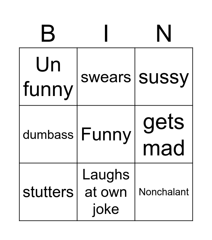 This bingo card has a free space and 8 words: gets mad, sussy, swears, stutters, Un funny, Nonchalant, dumbass and Laughs at own joke.