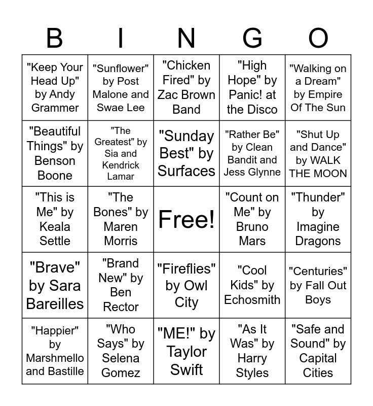 This bingo card has a free space and 28 words: "Centuries" by Fall Out Boys, "Bang!" by AJR, "good 4 u" by Olivia Rodrigo, "Rather Be" by Clean Bandit and Jess Glynne, "As It Was" by Harry Styles, "Beautiful Things" by Benson Boone, "Chicken Fired" by Zac Brown Band, "Sunflower" by Post Malone and Swae Lee, "Brave" by Sara Bareilles, "Count on Me" by Bruno Mars, "Happier" by Marshmello and Bastille, "This is Me" by Keala Settle, "High Hope" by Panic! at the Disco, "Who Says" by Selena Gomez, "ME!" by Taylor Swift, "Shut Up and Dance" by WALK THE MOON, "The Middle" by Zedd, Maren Morris, and Grey, "Brand New" by Ben Rector, "The Greatest" by Sia and Kendrick Lamar, "Sunday Best" by Surfaces, "Fireflies" by Owl City, "Keep Your Head Up" by Andy Grammer, "Burnin' Up" by Jonas Brothers, "Safe and Sound" by Capital Cities, "The Bones" by Maren Morris, "Thunder" by Imagine Dragons, "Cool Kids" by Echosmith, "Walking on a Dream" by Empire Of The Sun and "Happy" by Pharrell Williams.