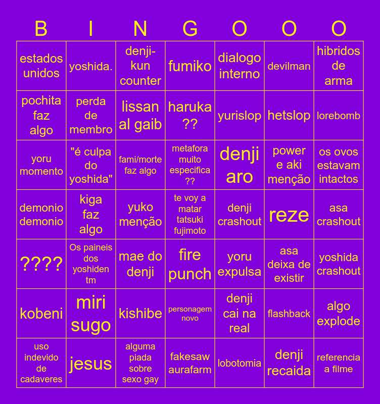 This bingo card has a free space and 48 words: denji cai na real, hetslop, fakesaw aurafarm, kiga faz algo, fami/morte faz algo, asa crashout, yoshida., jesus, devilman, fire punch, hibridos de arma, fumiko, power e aki menção, denji aro, kobeni, reze, pochita faz algo, lorebomb, flashback, dialogo interno, yurislop, yuko menção, estados unidos, perda de membro, algo explode, lissan al gaib, os ovos estavam intactos, uso indevido de cadaveres, metafora muito especifica ??, "é culpa do yoshida", denji recaida, denji crashout, yoshida crashout, miri sugo, demonio demonio, yoru expulsa, asa deixa de existir, yoru momento, mae do denji, kishibe, ????, referencia a filme, denji-kun counter, alguma piada sobre sexo gay, haruka ??, personagem novo, Os paineis dos yoshiden tm and lobotomia.