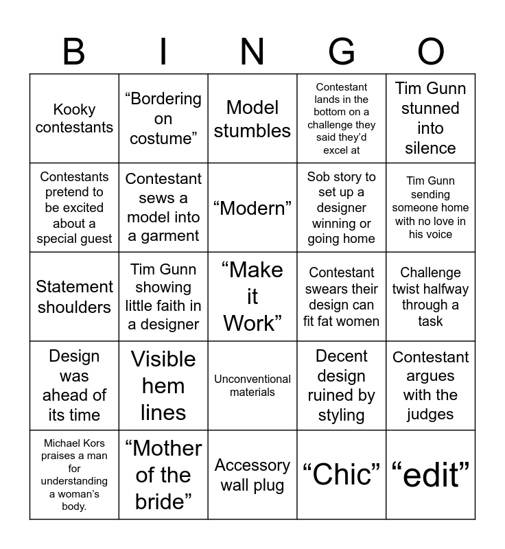 This bingo card has a free space and 24 words: Michael Kors praises a man for understanding a woman’s body., Visible hem lines, “Modern”, “Chic”, Tim Gunn stunned into silence, Kooky contestants, “Bordering on costume”, Model stumbles, Contestant swears their design can fit fat women, Challenge twist halfway through a task, Statement shoulders, Contestant sews a model into a garment, Decent design ruined by styling, Contestant argues with the judges, Contestants pretend to be excited about a special guest, “Mother of the bride”, Accessory wall plug, Contestant lands in the bottom on a challenge they said they’d excel at, Tim Gunn sending someone home with no love in his voice, Design was ahead of its time, Tim Gunn showing little faith in a designer, Unconventional materials, Sob story to set up a designer winning or going home and “edit”.