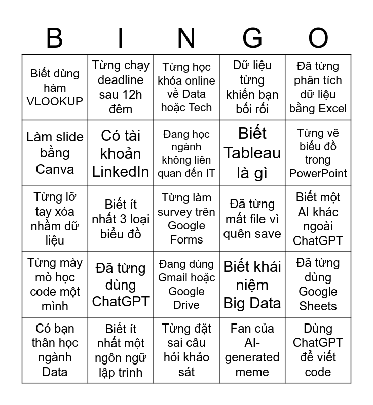 This bingo card has a free space and 24 words: Đã từng dùng ChatGPT, Biết ít nhất một ngôn ngữ lập trình, Đang học ngành không liên quan đến IT, Có bạn thân học ngành Data, Đã từng phân tích dữ liệu bằng Excel, Biết dùng hàm VLOOKUP, Làm slide bằng Canva, Từng chạy deadline sau 12h đêm, Đã từng mất file vì quên save, Đang dùng Gmail hoặc Google Drive, Biết Tableau là gì, Từng lỡ tay xóa nhầm dữ liệu, Biết khái niệm Big Data, Đã từng dùng Google Sheets, Có tài khoản LinkedIn, Fan của AI-generated meme, Biết một AI khác ngoài ChatGPT, Từng học khóa online về Data hoặc Tech, Từng vẽ biểu đồ trong PowerPoint, Biết ít nhất 3 loại biểu đồ, Dùng ChatGPT để viết code, Từng mày mò học code một mình, Dữ liệu từng khiến bạn bối rối and Từng đặt sai câu hỏi khảo sát.