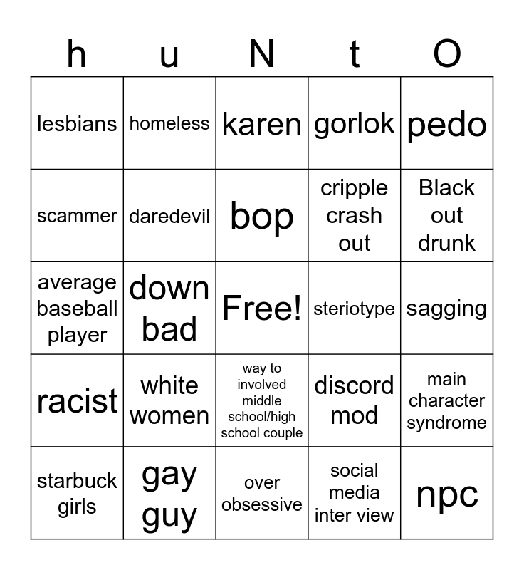 This bingo card has a free space and 24 words: white women, gay guy, bop, starbuck girls, pedo, lesbians, scammer, homeless, steriotype, way to involved middle school/high school couple, cripple crash out, average baseball player, discord mod, main character syndrome, daredevil, social media inter view, sagging, karen, Black out drunk, down bad, npc, racist, gorlok and over obsessive.