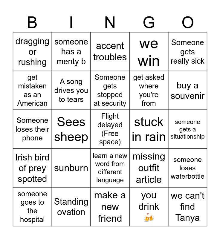This bingo card has a free space and 40 words: Someone sleeps in, Someone loses their phone, Someone doesn't show up at the meetup time, A song drives you to tears, Standing ovation, learn a new word from different language, Someone gets stopped at security, Tanya loses it, Someone gets really sick, Irish bird of prey spotted, Sees sheep, we win, we can't find Tanya, someone gets a situationship, stuck in rain, sunburn, people miss curfew, dragging or rushing, someone throws up, accent troubles, someone loses waterbottle, you drink 🍻, get asked where you're from, get mistaken as an American, pitch pipe issues, petty drama, a room gets shushed past curfew, plane delayed again, you try a new food, "you're such a young choir!", someone faints, someone goes to the hospital, loses/breaks costume item, missing outfit article, buy a souvenir, make a new friend, we lose but get an honorary mention, someone's alarm wakes EVERYONE up, someone has a menty b and someone snores.
