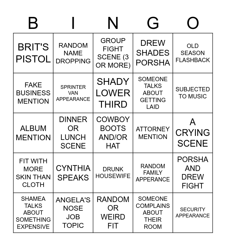 This bingo card has a free space and 24 words: CYNTHIA SPEAKS, ANGELA'S NOSE JOB TOPIC, SHADY LOWER THIRD, SHAMEA TALKS ABOUT SOMETHING EXPENSIVE, OLD SEASON FLASHBACK, BRIT'S PISTOL, FAKE BUSINESS MENTION, RANDOM NAME DROPPING, ATTORNEY MENTION, DRUNK HOUSEWIFE, SOMEONE TALKS ABOUT GETTING LAID, ALBUM MENTION, RANDOM FAMILY APPERANCE, PORSHA AND DREW FIGHT, SPRINTER VAN APPEARANCE, SOMEONE COMPLAINS ABOUT THEIR ROOM, A CRYING SCENE, GROUP FIGHT SCENE (3 OR MORE), SUBJECTED TO MUSIC, DINNER OR LUNCH SCENE, SECURITY APPEARANCE, FIT WITH MORE SKIN THAN CLOTH, DREW SHADES PORSHA and RANDOM OR WEIRD FIT.