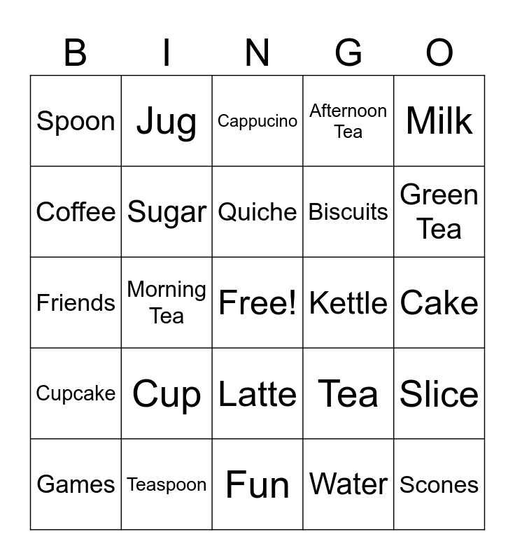 This bingo card has a free space and 29 words: Games, Plate, Morning Tea, Tea Cup, Spoon, Cappucino, Sugar, Cup, Kettle, Teaspoon, Cake, Scones, Fun, Water, Green Tea, Saucer, Latte, Cupcake, Milk, Friends, Tea, Fundraiser, Biscuits, Coffee, Afternoon Tea, Jug, Slice, Quiche and Sausage Roll.