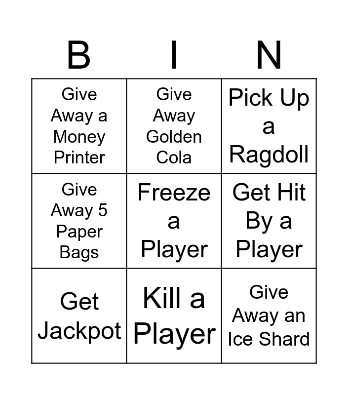 This bingo card has a free space and 9 words: Get Jackpot, Pick Up a Ragdoll, Give Away Golden Cola, Give Away 5 Paper Bags, Give Away a Money Printer, Get Hit By a Player, Give Away an Ice Shard, Kill a Player and Kill a Player.