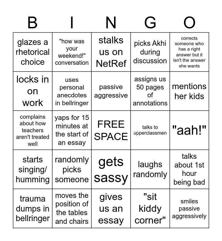 This bingo card has a free space and 39 words: says something about pop culture, talks about her son playing video games, trauma dumps, uses personal anecdotes in bellringer, trauma dumps in bellringer, gets sassy, passive aggressive, gives you the look when she wants you to talk more about what you're talking about, corrects someone who has a right answer but it isn't the answer she wants, starts singing/ humming, yaps for 15 minutes at the start of an essay, picks Akhi during discussion, smiles passive aggressively, "aah!", talks to upperclassmen, randomly picks someone, mentions her dad in bellringer, glazes a rhetorical choice, unnecessary google classroom comment, laughs randomly, locks in on work, gives us an essay, assigns us 50 pages of annotations, mentions her kids, gets frustrated at the clever touch, complains about some school policy, makes us get out the AP scoring rubric, uses gen-Z slang, uses bellringer vocab outside of bellringer, "how was your weekend!" conversation, makes a concerned face, mentions chatGPT, stalks us on NetRef, moves the position of the tables and chairs, "sit kiddy corner", dividers, talks about 1st hour being bad, complains about how teachers aren't treated well and hates on reid.