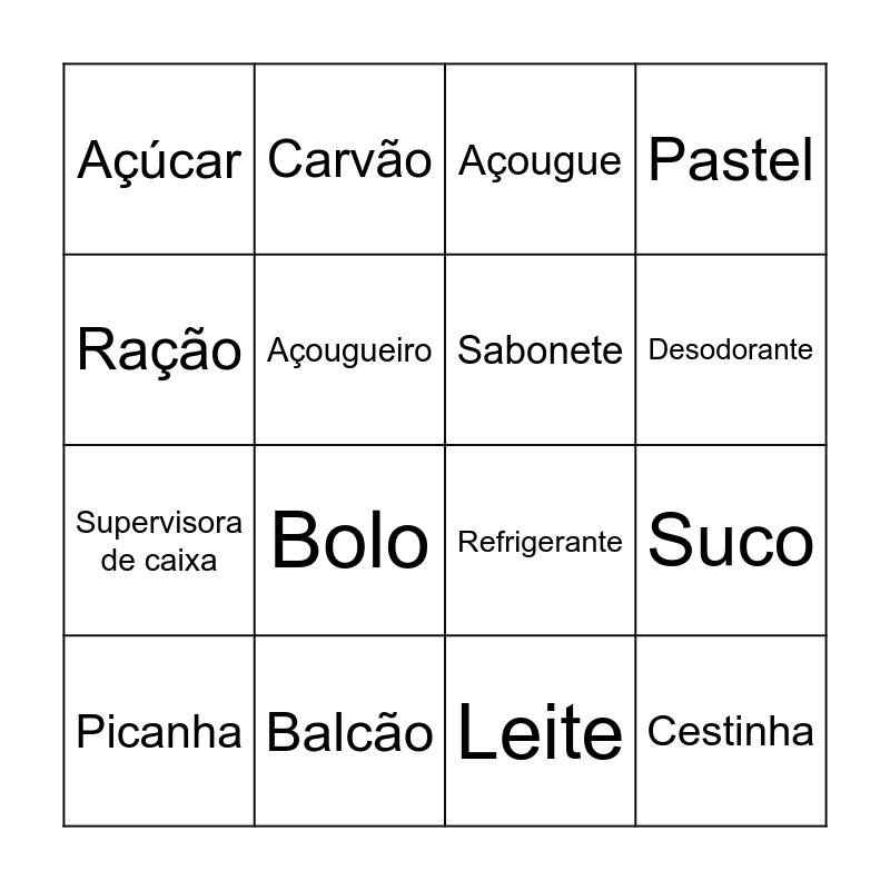 This bingo card has 80 words: Café, Supermercado, Açougue, Pão francês, Mamão, Shampoo, Caixa, Atendente, Hortifruti, Arroz, Padaria, Sabão em pó, Pastel, Açúcar, Gerente, Açougueiro, Brócolis, Padeiro, Confeitaria, Leite, Repositor, Ração, Refrigerante, Desodorante, Sabonete, Condicionador, Frente de caixa, Feijão, Óleo, Chocolate, Bolo, Salgadinho, Pastel, Pão de nata, Amaciante, Balcão, Desengordurante, Detergente, Contra filé, Picanha, Danone, Hambúrguer, Sonho, Cavaquinho, Linguiça, Carvão, Descartáveis, De Pieri, Pizza, Sal grosso, Sorvete, Suco, Tempero, Abóbora, Ovo, Nescau, Pão doce, Pudim, Carne moída, Líder, Supervisora de caixa, Azeite, Laranja, Maçã, Mussarela, Presunto, Pão de alho, Frango, Filé de de tilápia, Papel higiênico, Cestinha, Balança, Cenoura, Tomate, Melão Etiqueta, Gerar preço, Creme de leite, Gelatina, Batata palha and Torta.