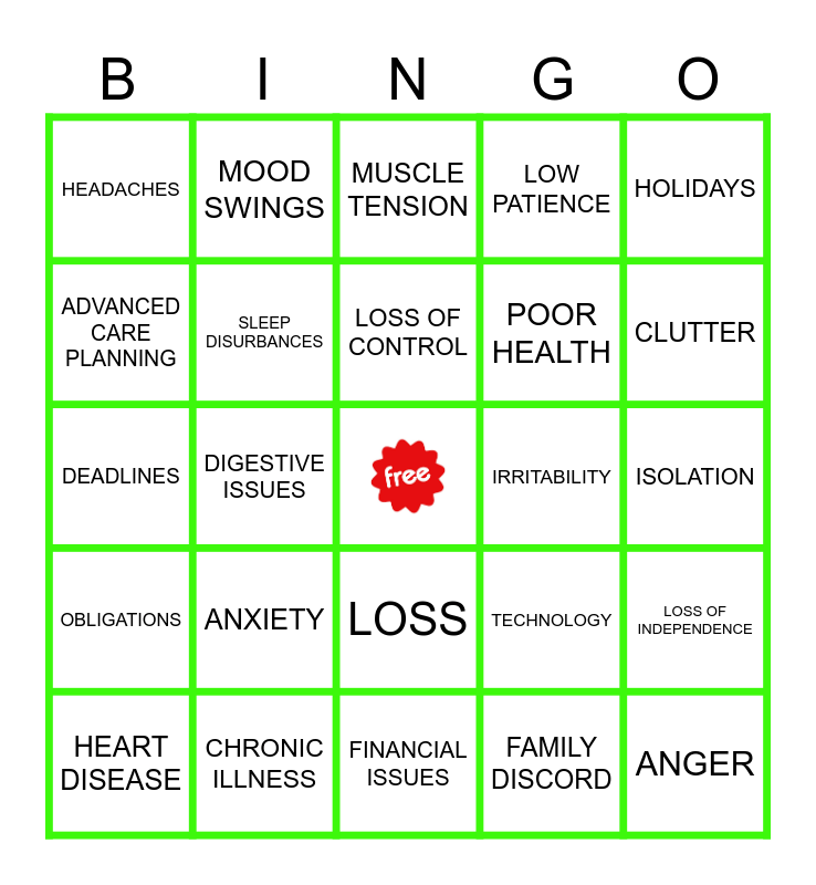 This bingo card has a free space and 29 words: HEART DISEASE, WEAKENED IMMUNE SYSTEM, DIGESTIVE ISSUES, WEIGHT LOSS/GAIN, HEADACHES, MUSCLE TENSION, SLEEP DISURBANCES, ANXIETY, IRRITABILITY, CHRONIC ILLNESS, ISOLATION, ANGER, FINANCIAL ISSUES, FAMILY DISCORD, CLUTTER, ILLNESS, LOSS, OBLIGATIONS, HOLIDAYS, DEADLINES, TECHNOLOGY, CRIME, POOR HEALTH, ADVANCED CARE PLANNING, LOW PATIENCE, MOOD SWINGS, LOSS OF INDEPENDENCE, LOSS OF CONTROL and UNCERTAINTY.