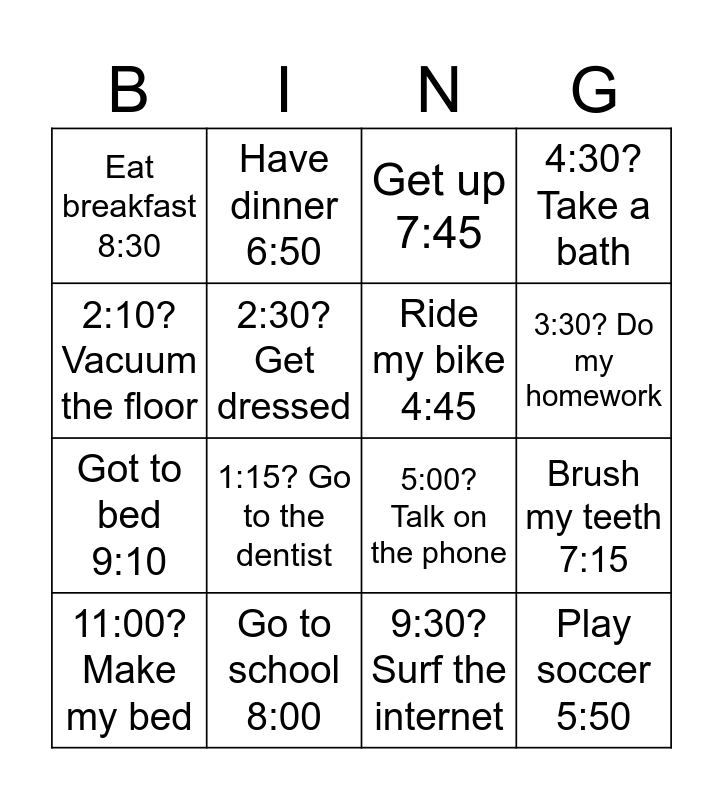 This bingo card has 16 words: Go to school 8:00, Brush my teeth 7:15, Get up 7:45, Eat breakfast 8:30, Got to bed 9:10, Have dinner 6:50, 5:00? Talk on the phone, 9:30? Surf the internet, 2:10? Vacuum the floor, 2:30? Get dressed, 11:00? Make my bed, 4:30? Take a bath, 1:15? Go to the dentist, 3:30? Do my homework, Ride my bike 4:45 and Play soccer 5:50.