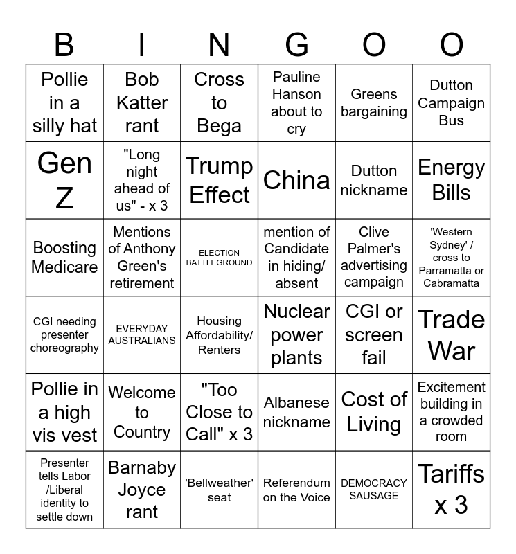 This bingo card has 36 words: CGI needing presenter choreography, EVERYDAY AUSTRALIANS, 'Bellweather' seat, China, Clive Palmer's advertising campaign, 'Western Sydney' / cross to Parramatta or Cabramatta, Pollie in a silly hat, Barnaby Joyce rant, Cross to Bega, Albanese nickname, Dutton nickname, Dutton Campaign Bus, Pollie in a high vis vest, Mentions of Anthony Green's retirement, Trump Effect, Pauline Hanson about to cry, Cost of Living, Trade War, Gen Z, "Long night ahead of us" - x 3, Housing Affordability/ Renters, Nuclear power plants, CGI or screen fail, Excitement building in a crowded room, Boosting Medicare, Bob Katter rant, ELECTION BATTLEGROUND, Referendum on the Voice, Greens bargaining, Energy Bills, Presenter tells Labor /Liberal identity to settle down, Welcome to Country, "Too Close to Call" x 3, mention of Candidate in hiding/ absent, DEMOCRACY SAUSAGE and Tariffs x 3.
